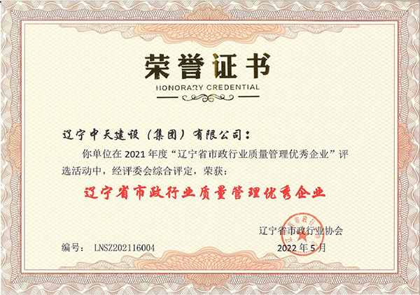 企业先后荣获“全国优秀施工企业”、 “中国AAA级信用企业”、“全国保障性安居工程建设劳动竞赛先进单位”、“辽宁省最受尊敬企业”、“辽宁省优秀建筑业企业”、“辽宁省工程建设质量管理优秀企业”、 “辽宁省守合同、重信用企业”、辽宁省“AAA级信用企业”、 “抚顺市安全生产先进单位、红旗单位”、“抚顺市安康杯竞赛先进集体”等多项殊荣。
