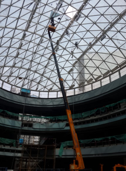 此次检测,大家克服了中庭椭圆采光顶钢龙骨离地面较高,现场交叉作业复杂,工期紧,人员混杂等给现场准备工作带来的诸多困难,圆满完成了检测任务。